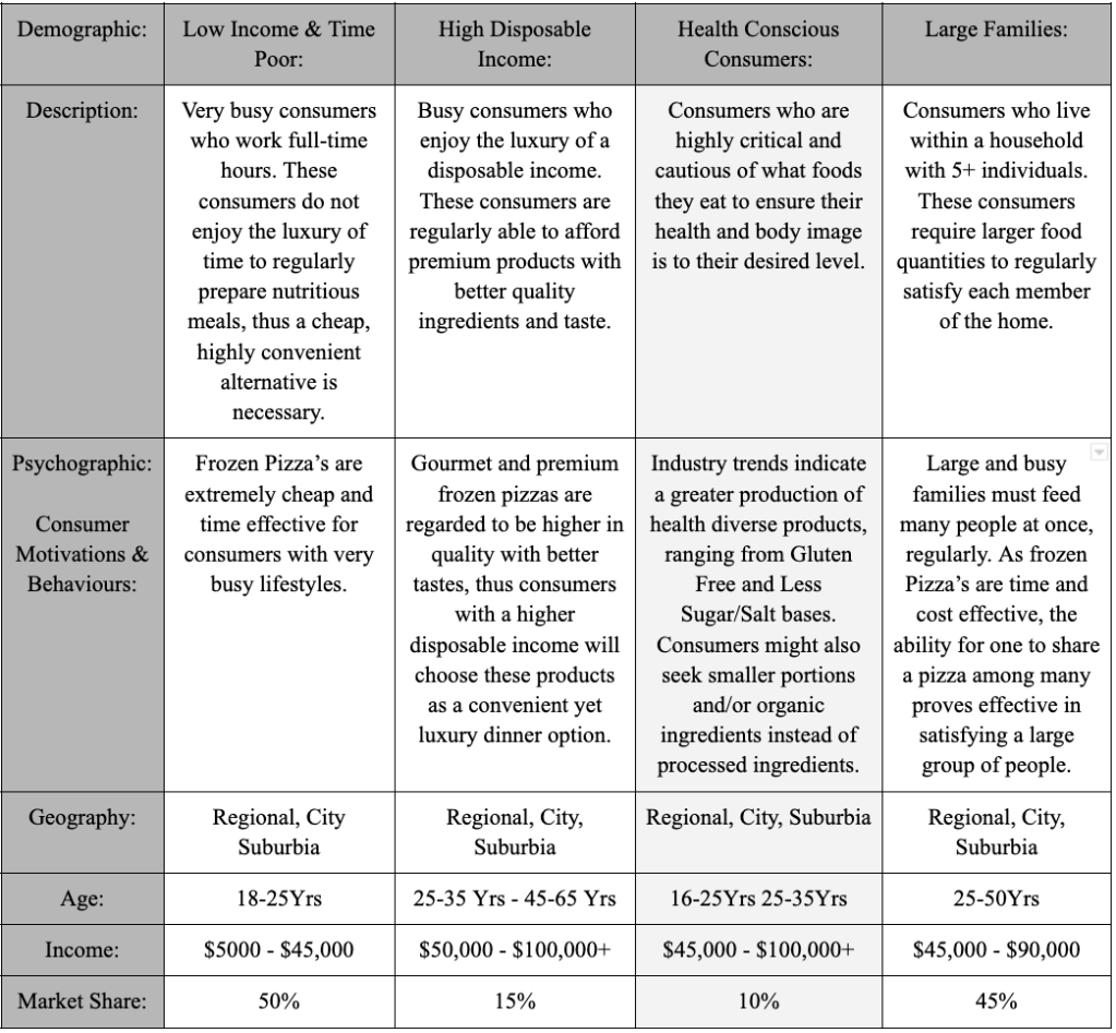 Frozen Pizzas, to most Australians are perceived to be ‘relatively cheap.’ (Richardson, 2020, pg. 24) According to the Australian Bureau of Statistics (ABS) the average weekly earnings for a full-time working adult is $1,835.30 suggesting that most working adults are entitled to a disposable income below $2000 each week. Canstar Blue further illuminates that the average Australian household ‘spends $152 weekly on groceries equating to $608 a month or $7,296 a year.’ Finance Professor, Ljubica Georgievska brings attention to the fact that 63.77% of single parent households with children are more likely to opt for cheaper food alternatives, with 49.66% of childless couple households opting for similar inexpensive food options. Furthermore, Georgievska reveals that 60.92% of couples’ households with children are opting for more inexpensive food options during weekly groceries shopping. With specific relation to the Frozen Pizza industry, Canstar Blue also suggests that frozen items make up 46% of the average Australian’s groceries. It becomes clear that frozen pizza products may be appealing to low-income households due to their existence as a ‘a low-cost substitute’ for costly takeaway meals or restaurant dining experiences. (Richardson, 2022, pg. 10) In response, frozen pizza options can thus provide consumers a level of ‘convenience,’ due to its low effort preparation factor, providing time-poor consumers a highly beneficial food alternative to fit within their busy lifestyles. (Richardson, 2022, pg. 9) Consumers who enjoy a higher disposable income, however, are able to enjoy the freedom of ‘buy[ing] more premium frozen pizza offerings,’ regardless of their typically higher price point, permitting them to enjoy the luxury of gourmet products or products with higher quality ingredients. (Richardson, 2022, pg. 17) Consumers with a lower disposable income are, in effect, more likely to ‘readjust’ their spending habits regarding weekly groceries, opting for cheaper frozen pizza offerings to reduce tensions that may exist within food budgets. (Richardson, 2022, pg. 17) Overall, unlike high-income consumers, this factor disallows lower-income earning consumers to frequently enjoy higher quality, more healthier options that are available in supermarkets.