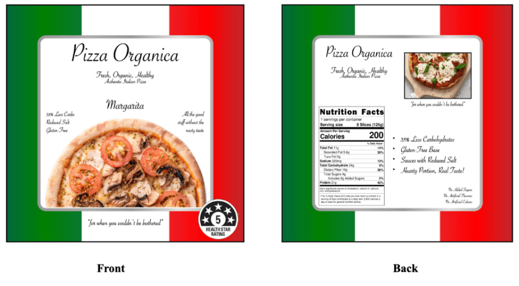 Considering Pizza Organica is a premium, ‘healthy’ pizza, all the packaging for the product will maintain a sleek, minimal design, a creative decision focused on representing the brand as an almost luxurious choice, differentiating it from the colourful nature of traditional frozen pizza packaging. In utilising a monochromatic design with formal fonts and national Italian colours, the visual nature of the product will attempt to further illustrate its premium nature, but also, its presentation as an ‘authentic’ Italian product as well. In photographing an image of the pizza atop the front of the packaging, consumers can gather an idea of what the pizza will look like once it has been prepared. Pizza Organica will utilise a tagline, emphasising the health factors of the product, in suggesting Pizza Organica provides ‘all the good stuff without the nasty taste,’ the brand is actively comparing itself to other, traditional frozen pizza products, suggesting itself as the best alternative. Similarly, the product will utilise a slogan, emphasising the convenience and time-effectiveness of the product, encapsulated by the simple phrase, ‘for when you just couldn’t be bothered’ [to cook].